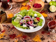 z pomidorami, ogórkiem, papryką, cebulą, natką pietruszki i cytryną