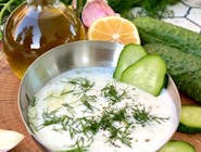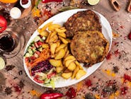 smażony placek z cukinii 80g z pitą lub grillowaną bułką, surówką i sosem