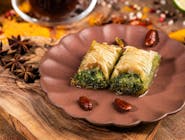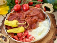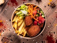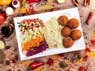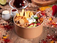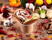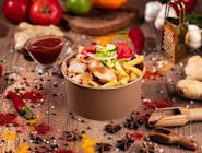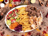 z mięsem 100g, przyprawionym mielonym mięsem lahmacun, mięsem z kebaba, surówką i sosem z frytkami 100g -