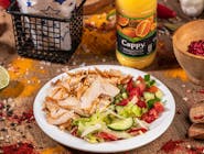pieczone mięso z kurczaka z sałatą lodową, pomidorami, ogórkiem, natką pietruszki i oliwą z oliwek -