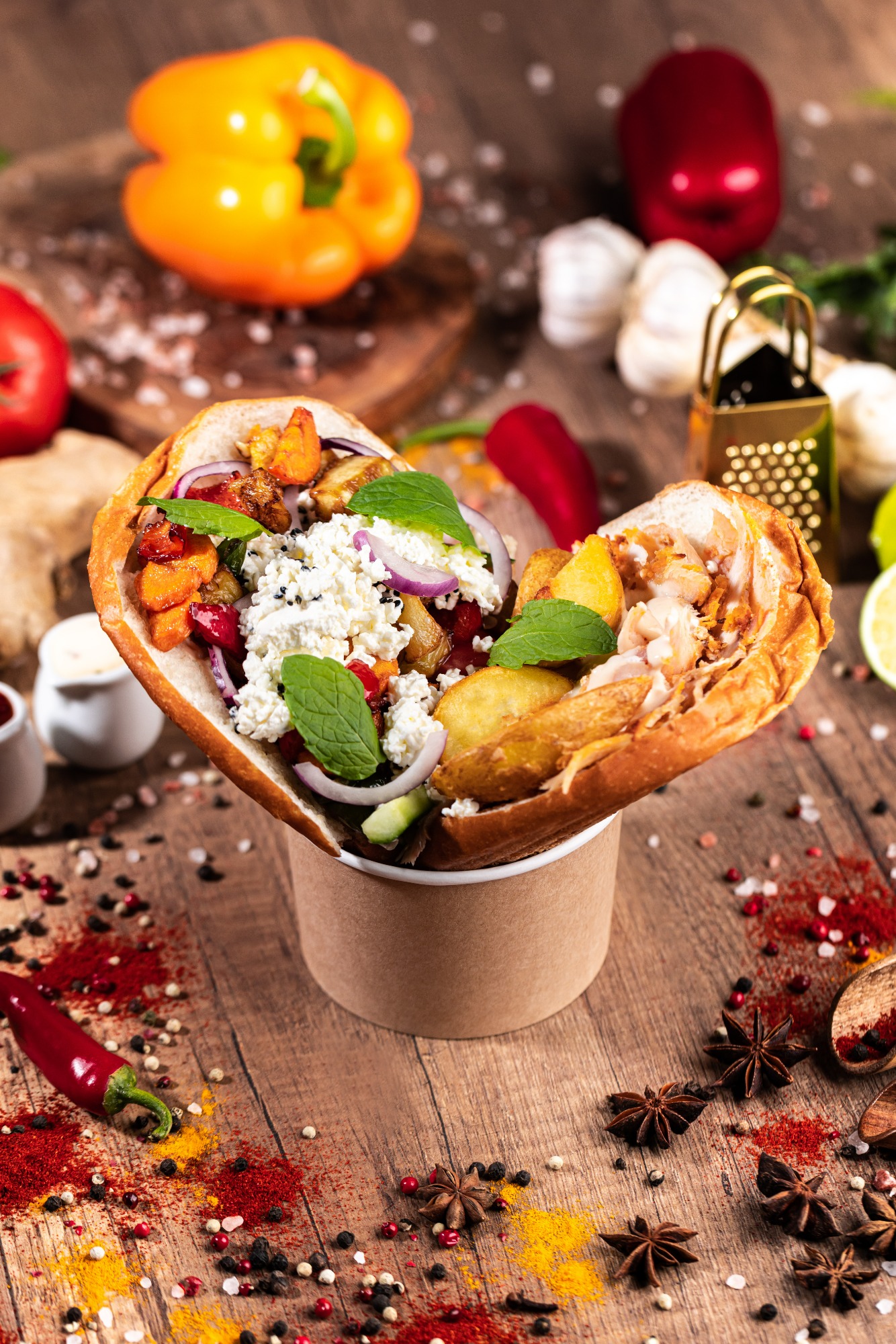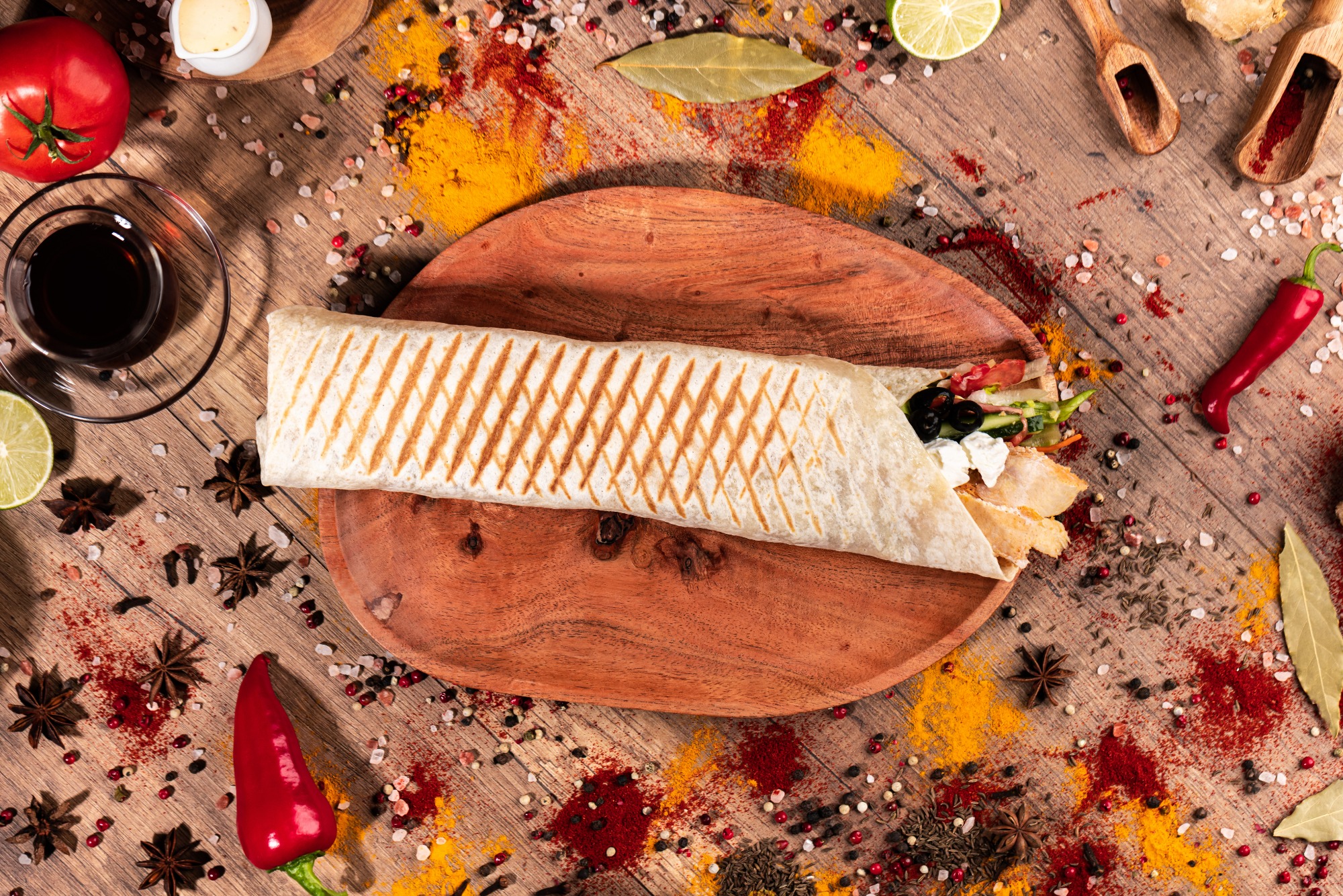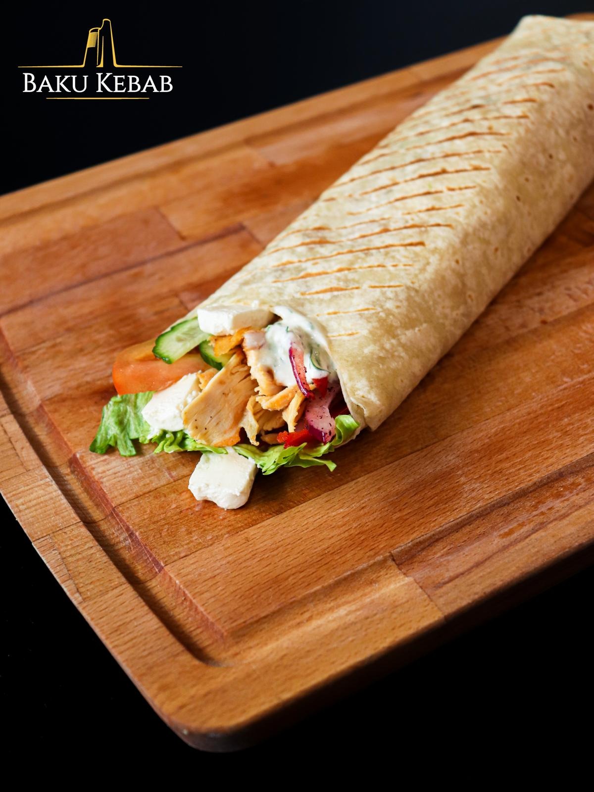 z pieczonym mięsem z kurczaka, pełnoziarnistą pitą, surówką i sosem o obniżonej zawartości tłuszczu