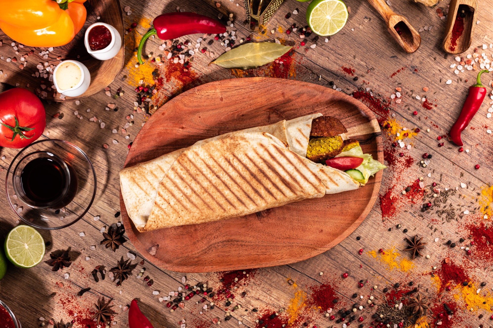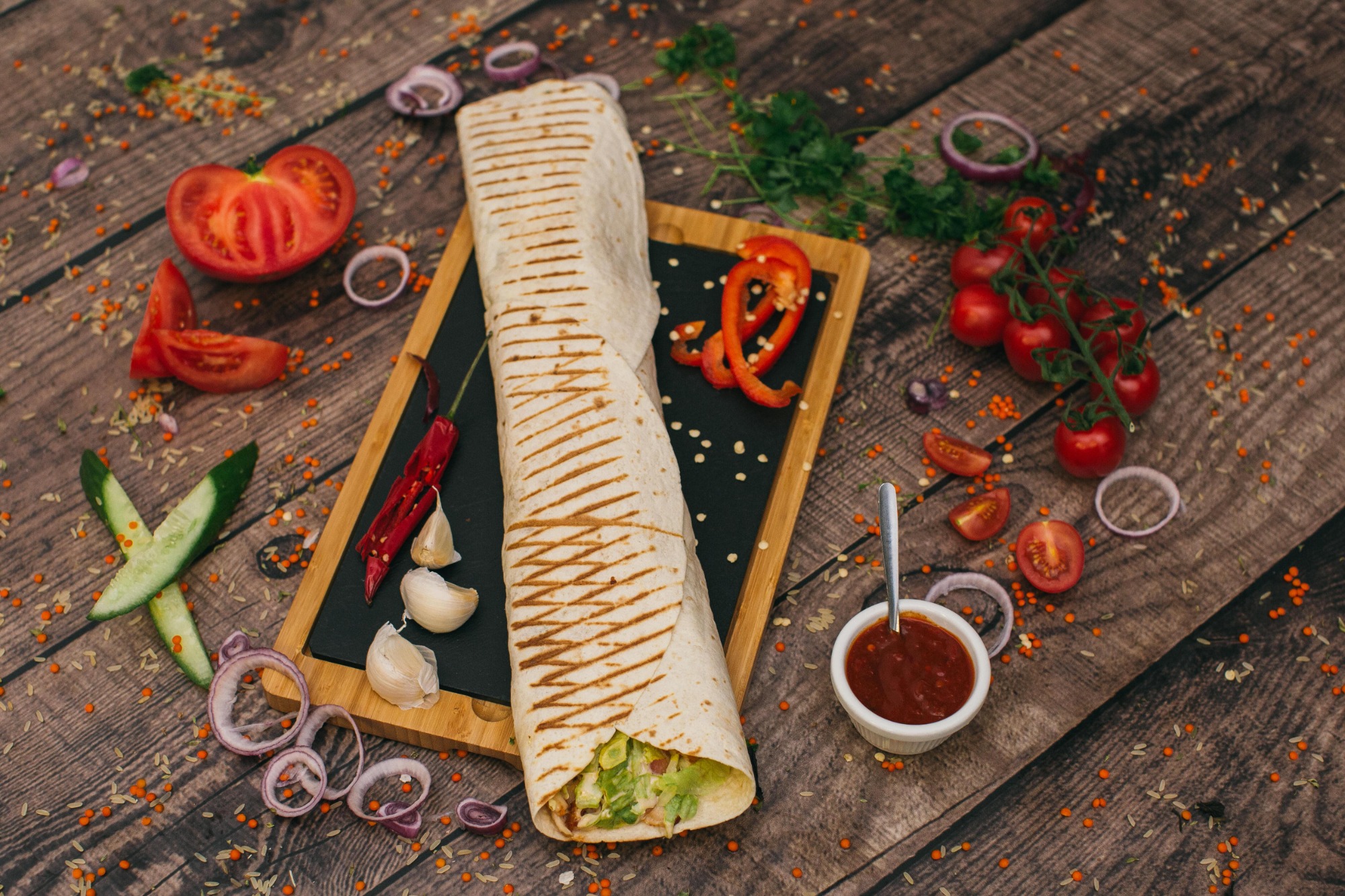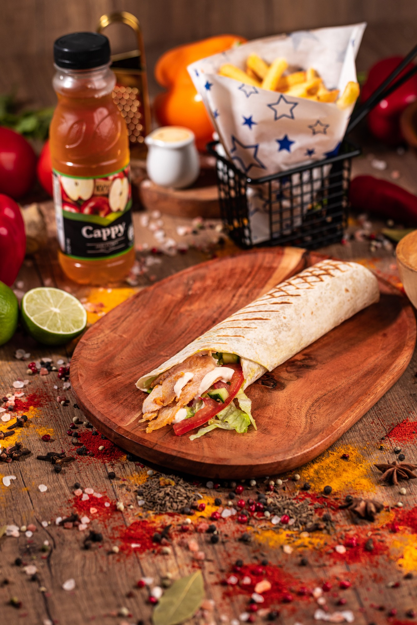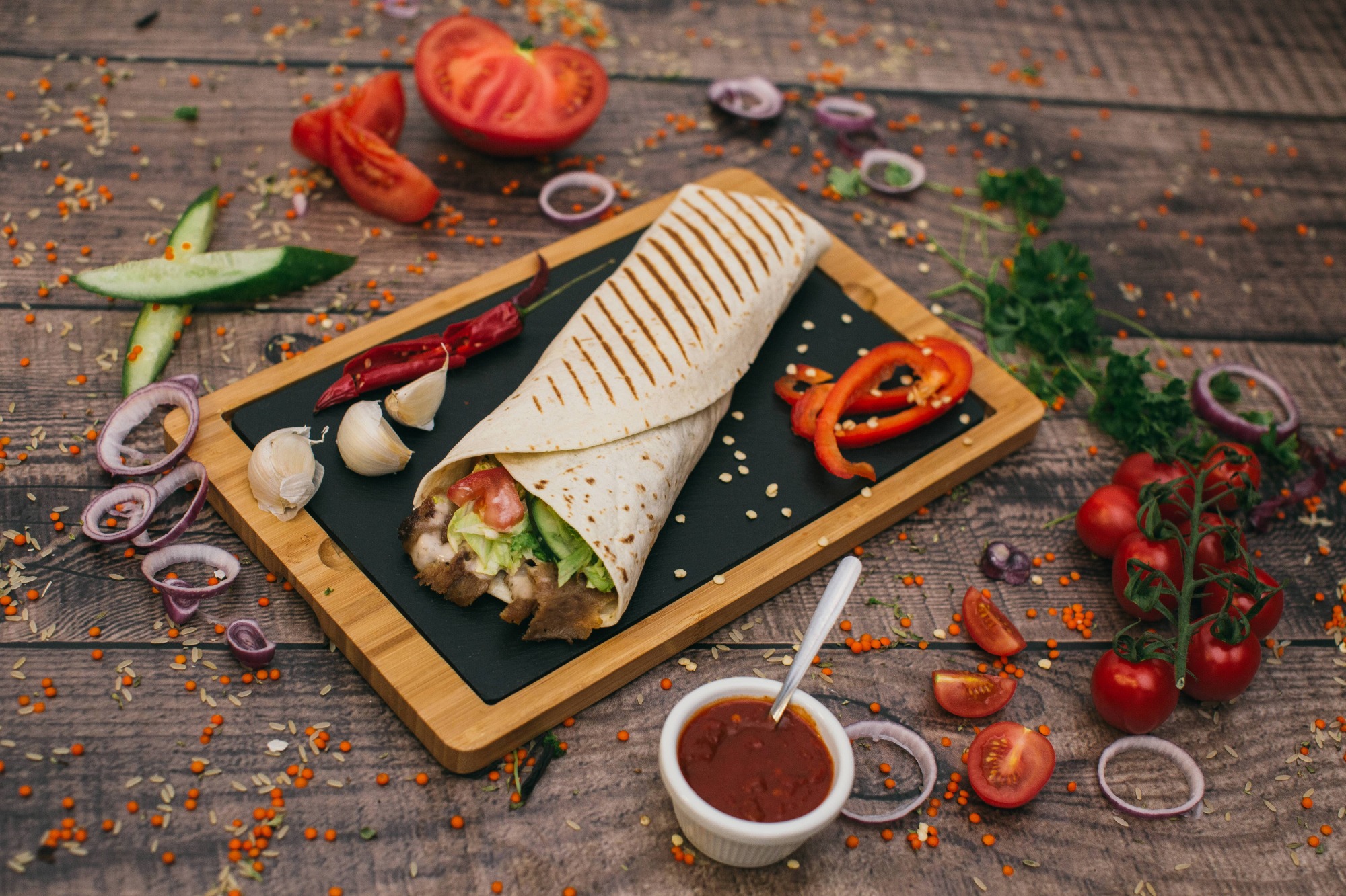 pieczone mięso ( wołowina 200g, kurczak 220g, mieszany 220g ), ciasto lawasz, surówka, sos -